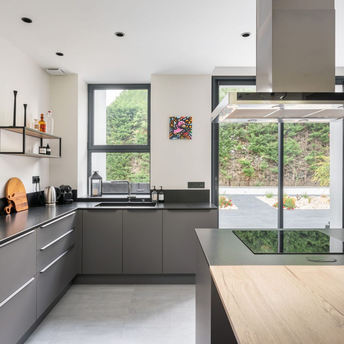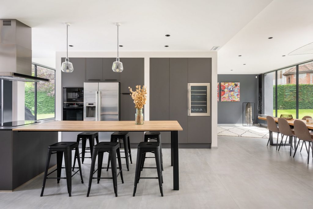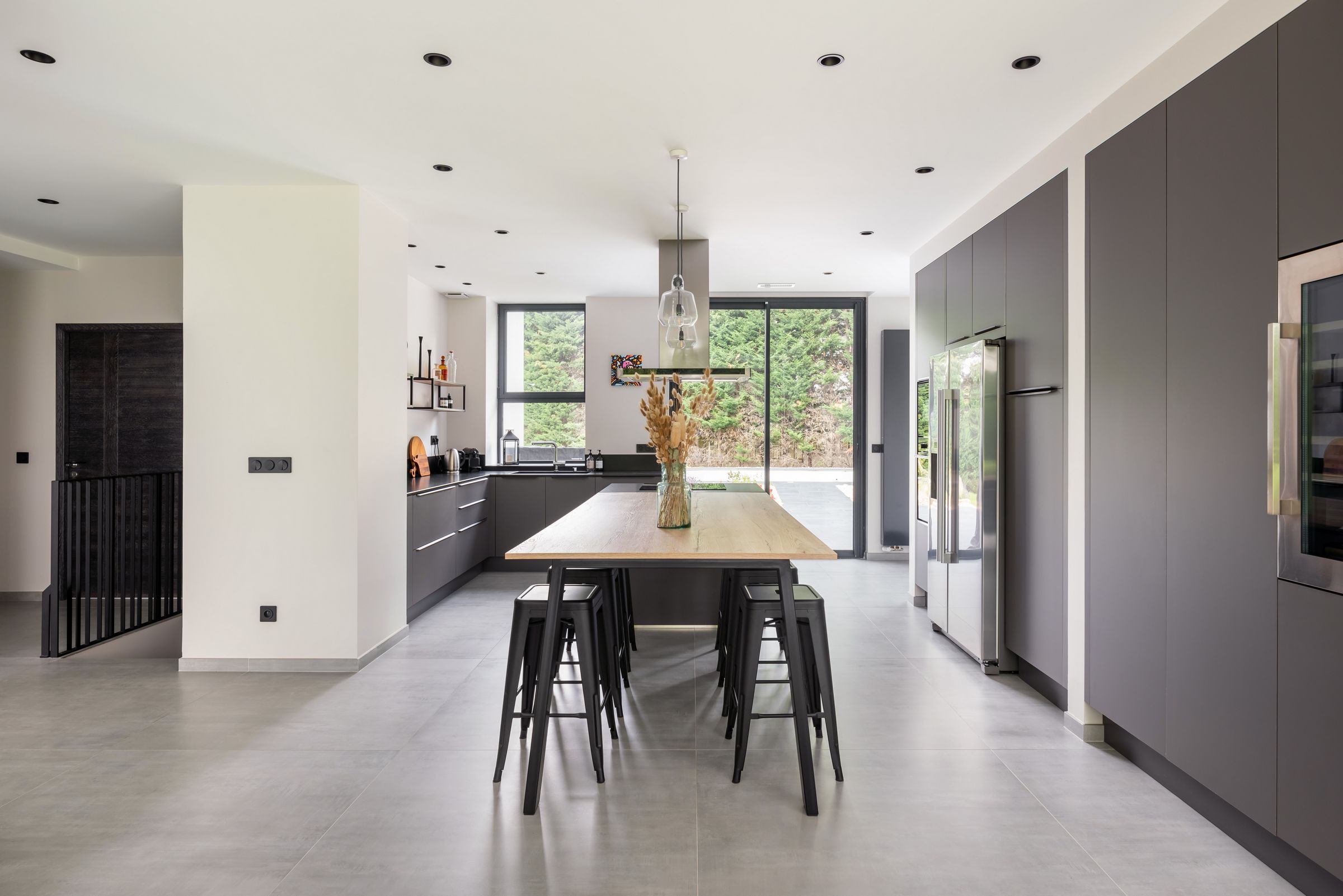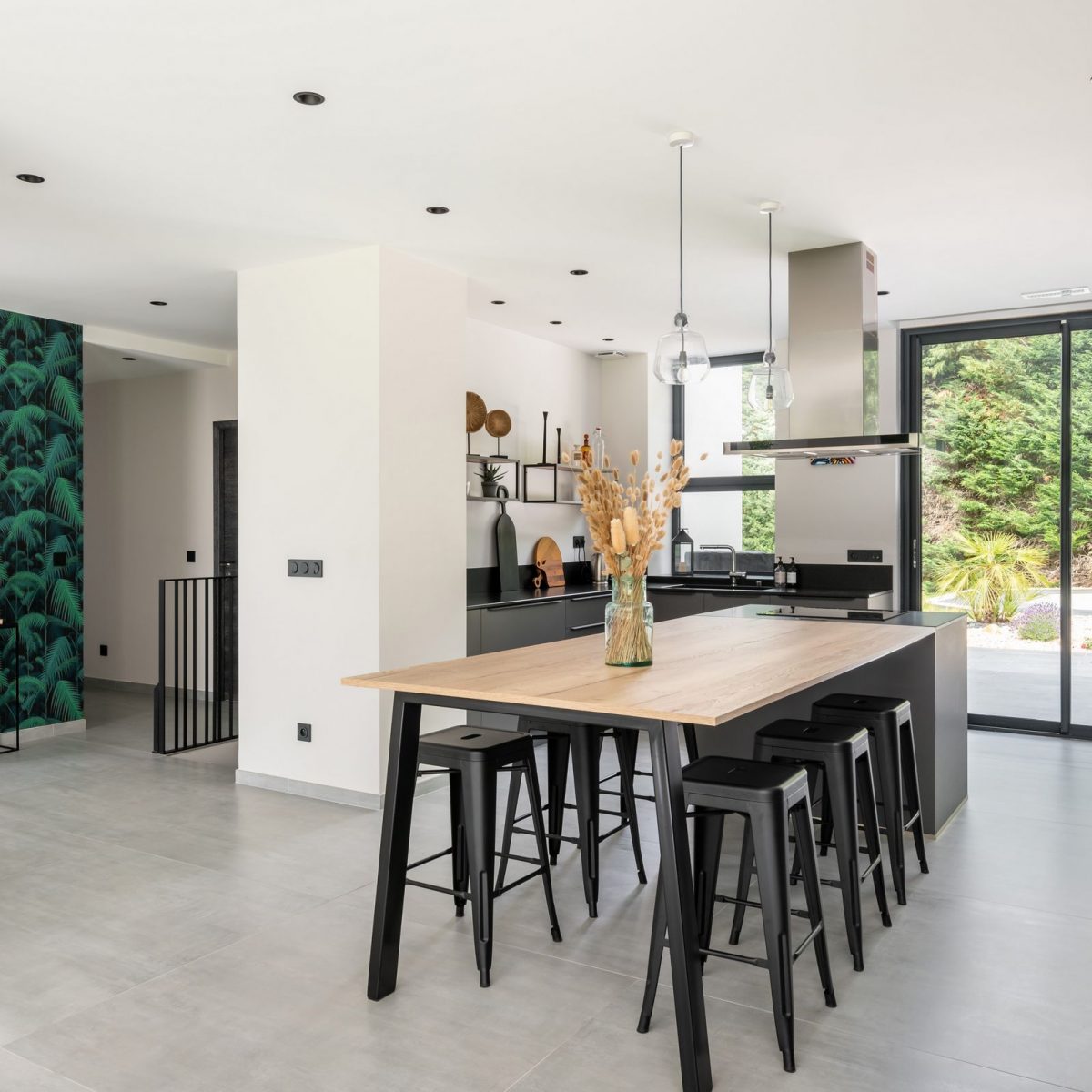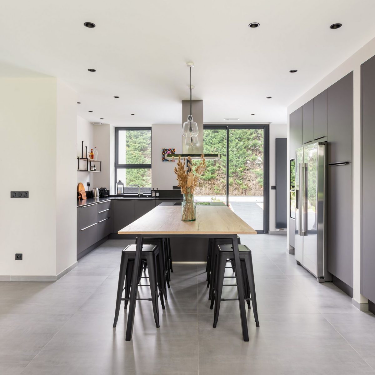Le nouvel aménagement, composé autour d’une cuisine moderne faisant le lien entre salon, séjour et hall d’entrée, permet une lecture aisée du volume.