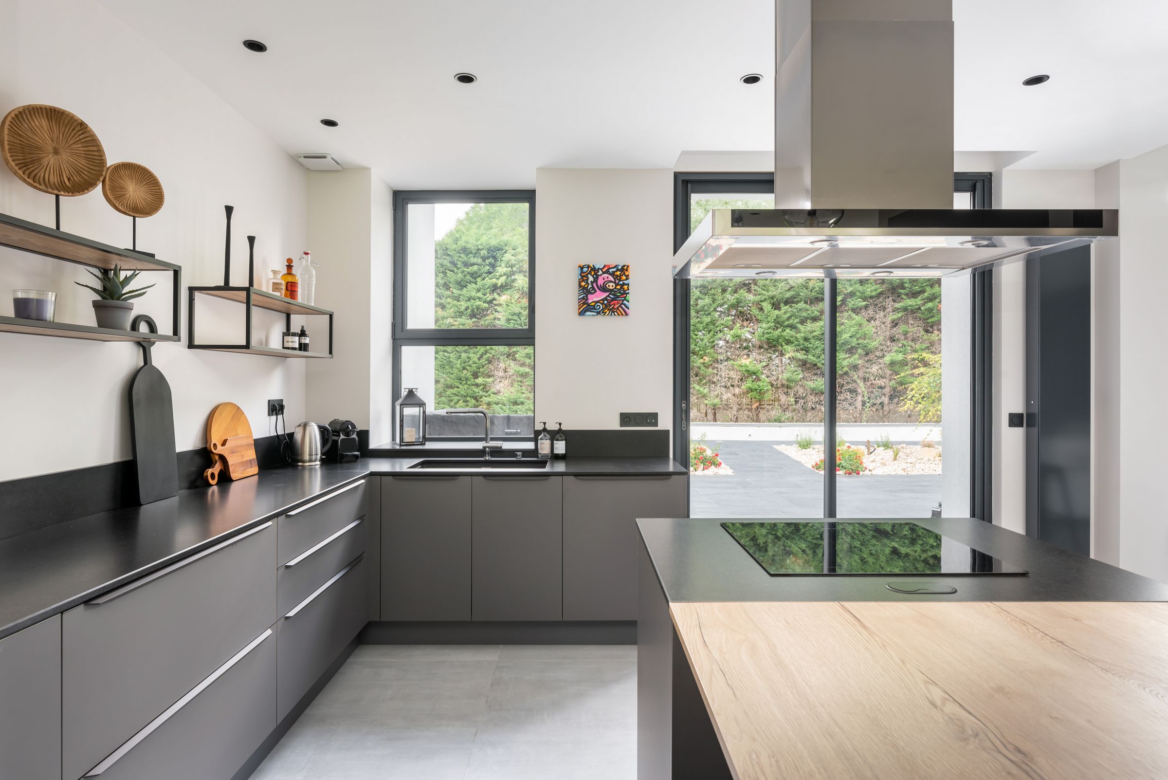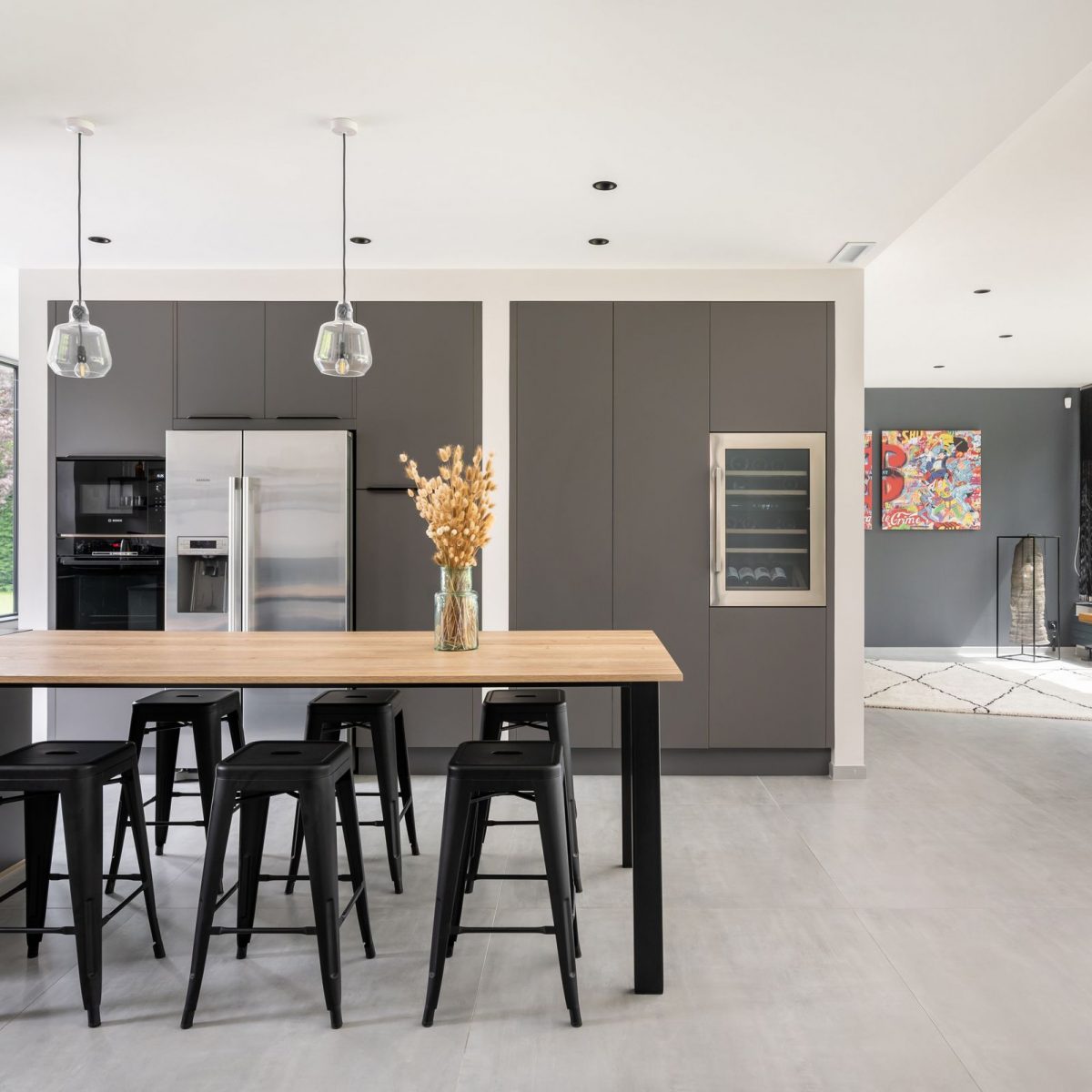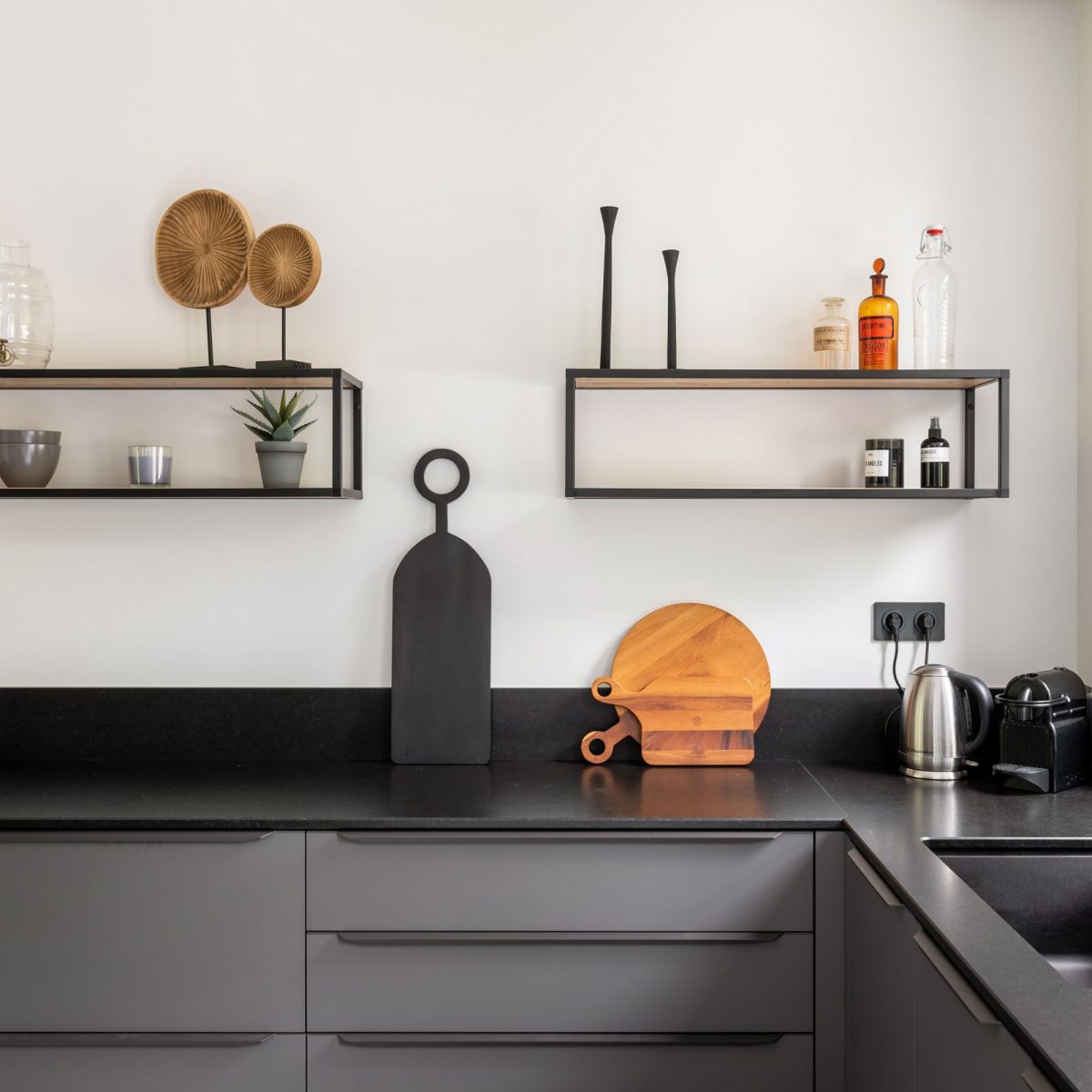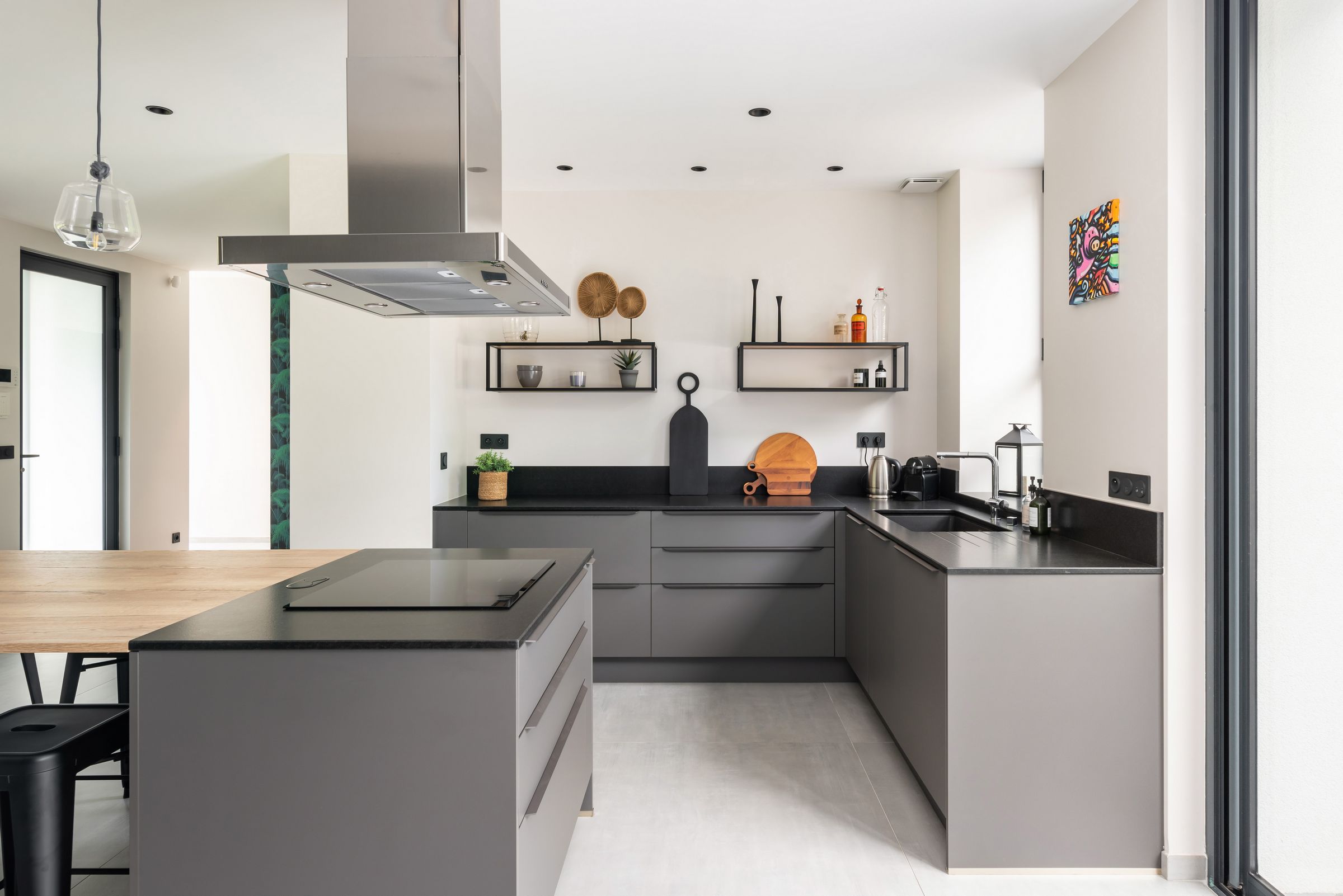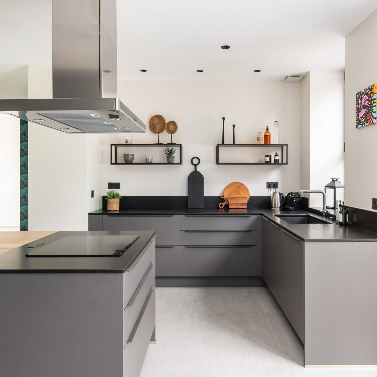 J’ai proposé une cuisine intégralement noire et mate, afin d’apporter un fort contraste visuel.