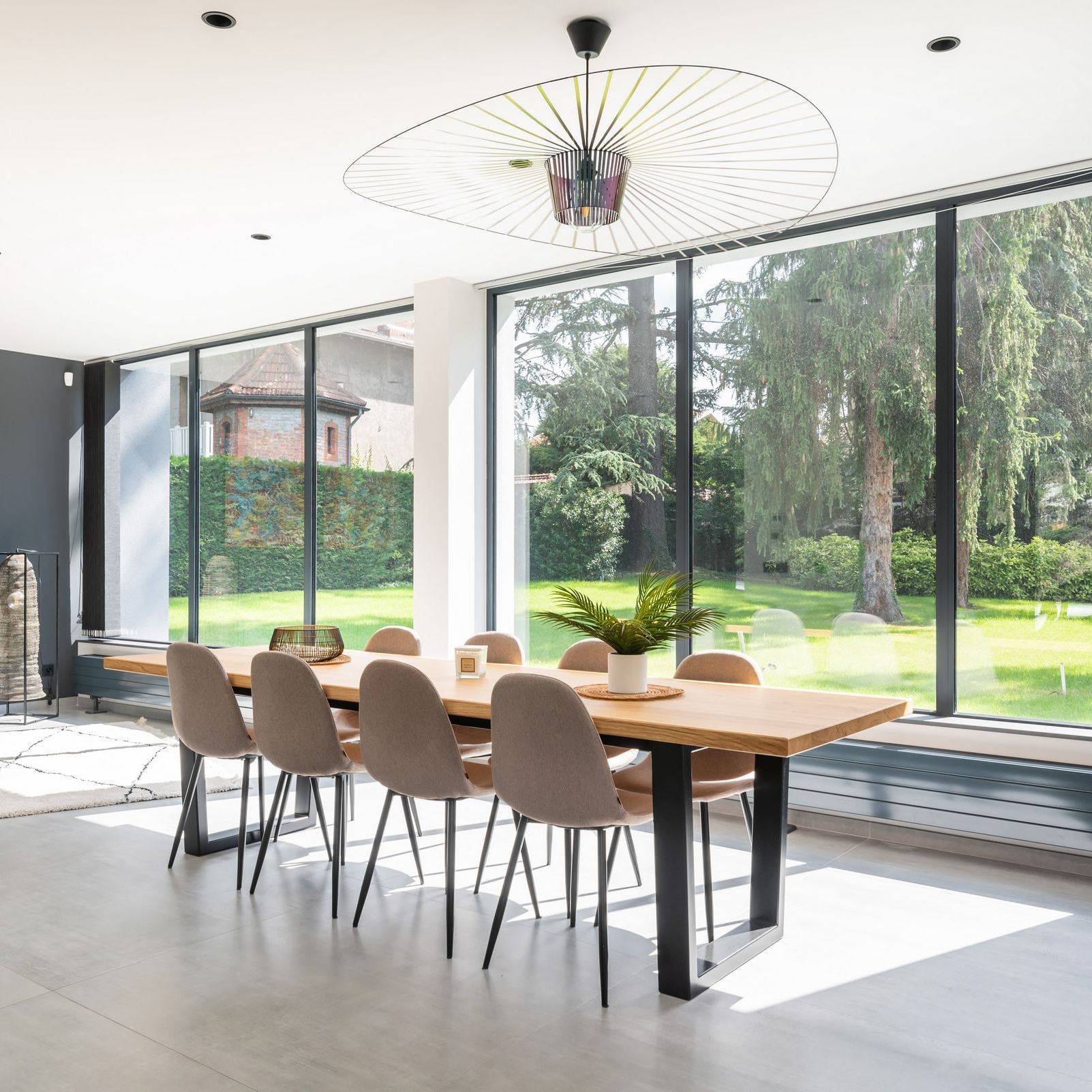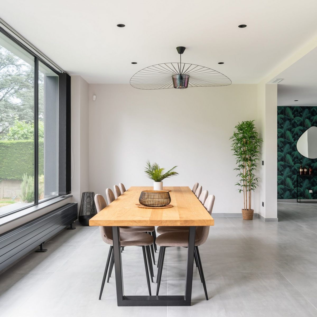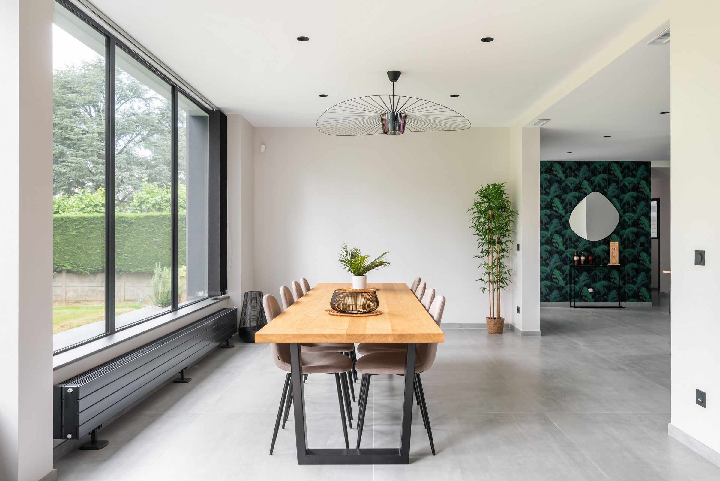 La salle à manger, baignée de lumière naturelle, résonne avec la cuisine et le salon.
