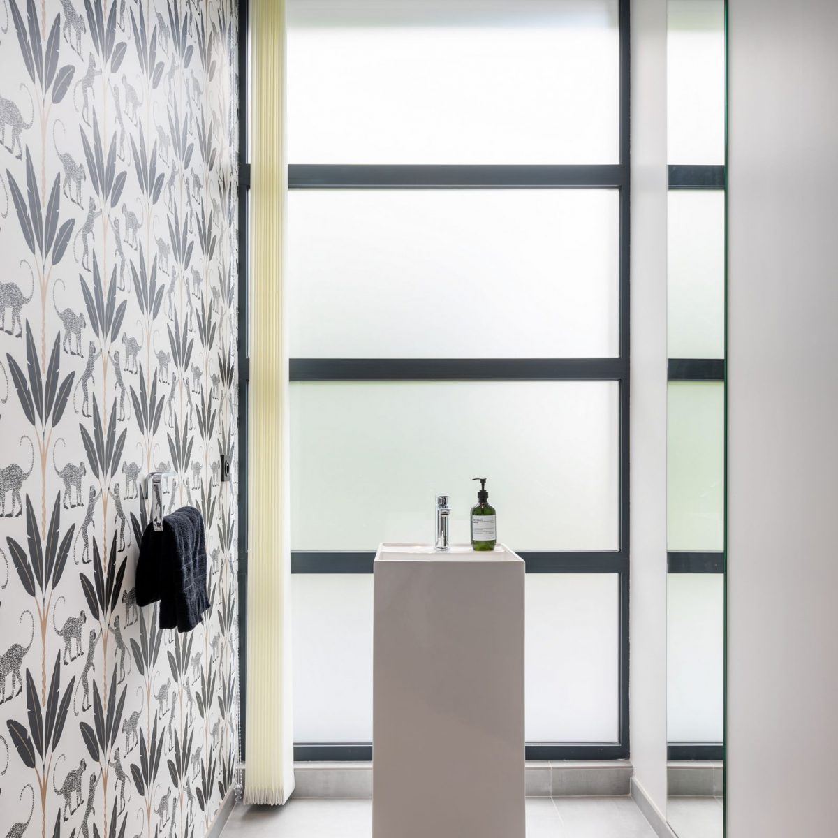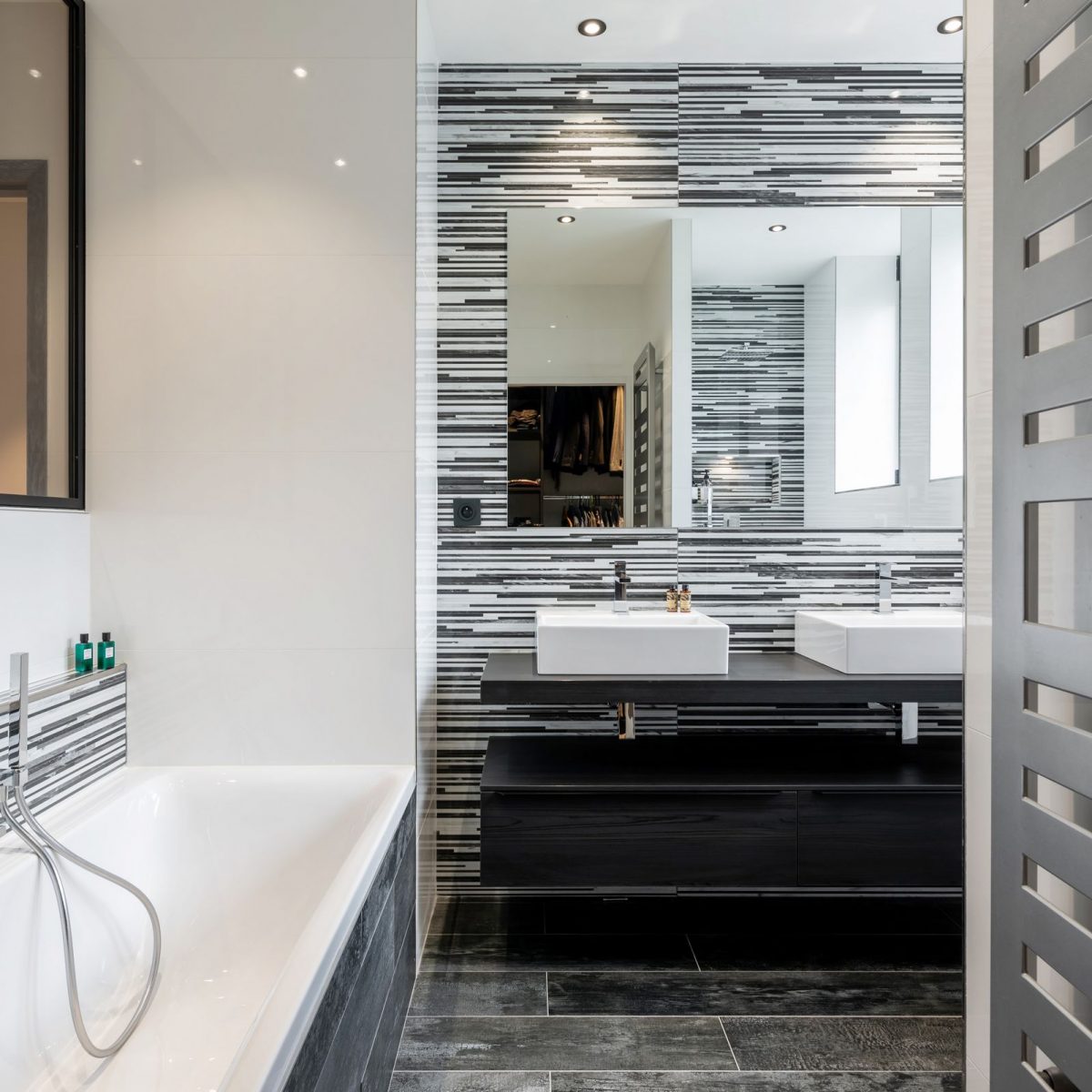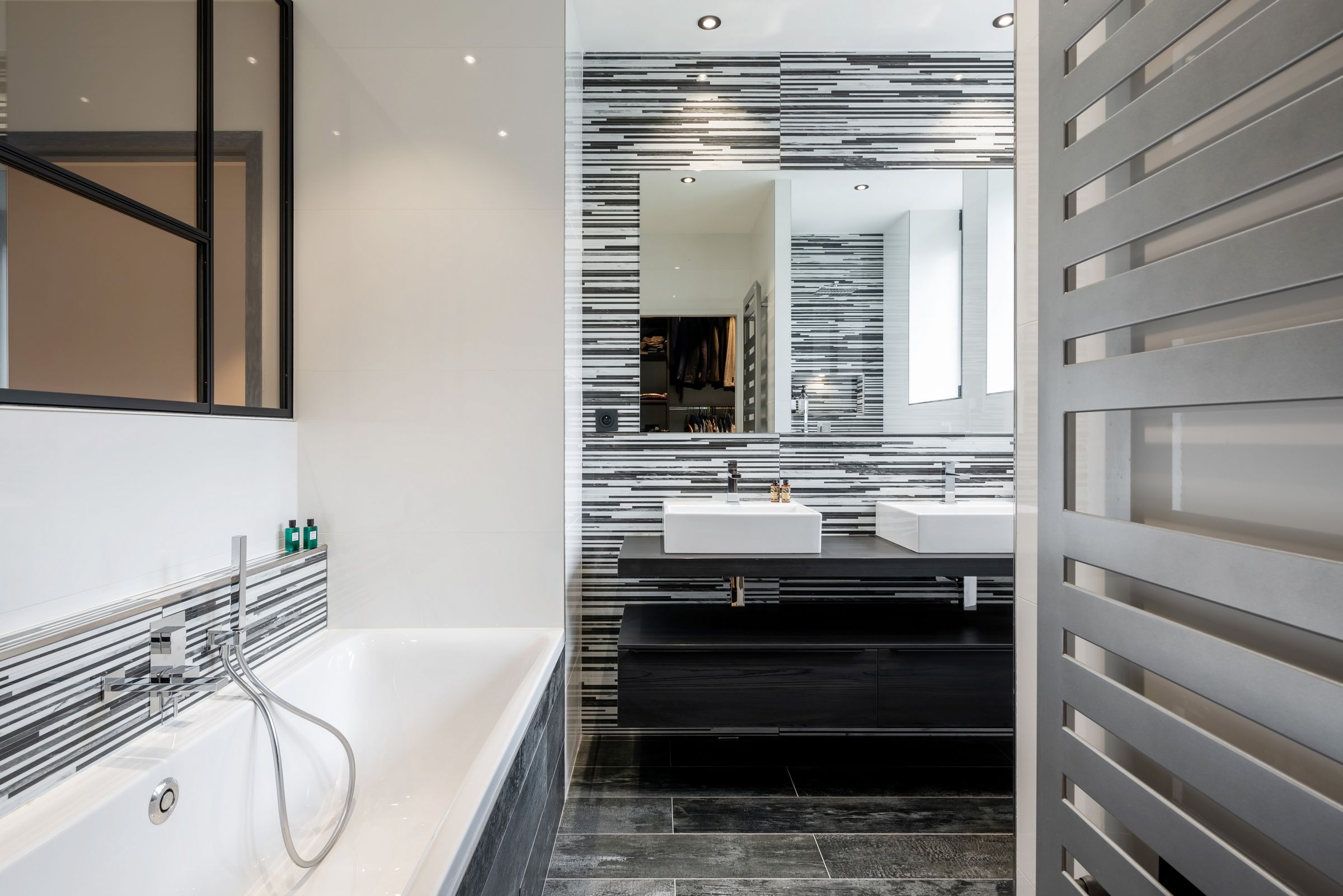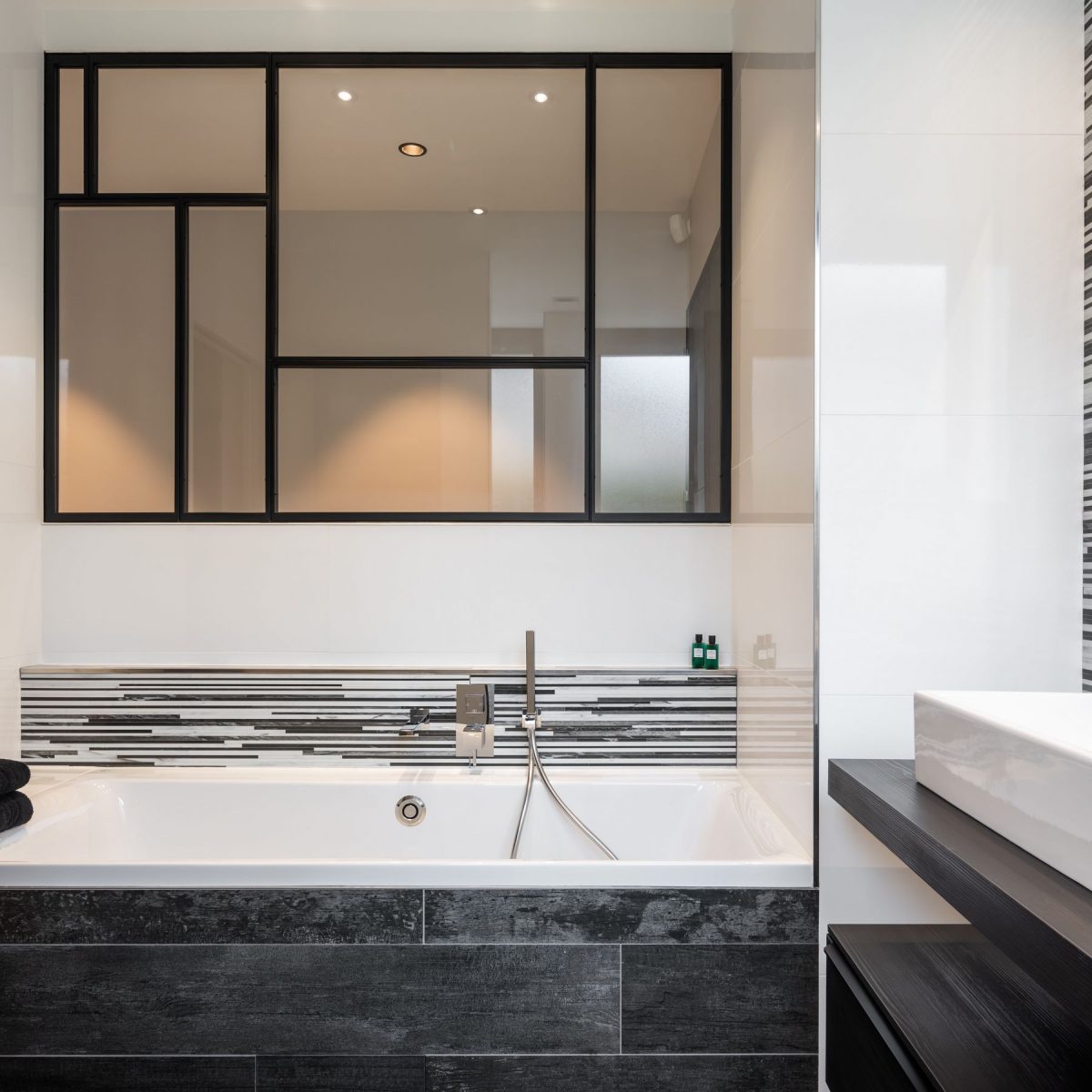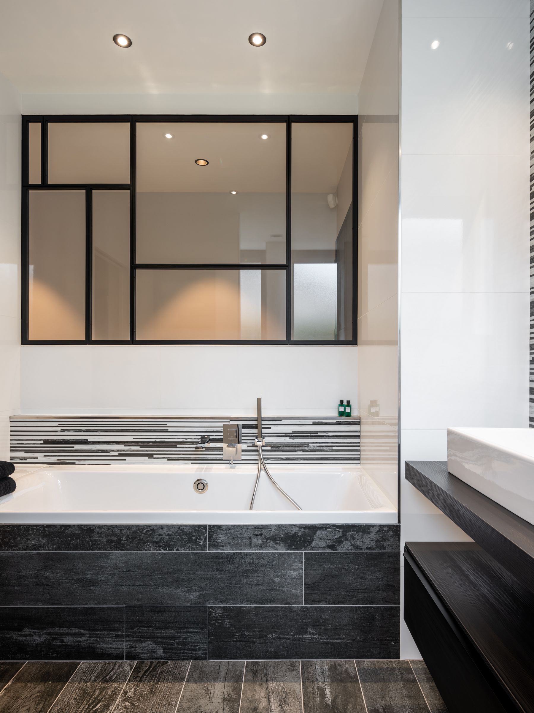 La salle de bains noire et blanc, résolument moderne et graphique, se compose notamment d’une baignoire surplombée par la verrière dessinée sur mesure.