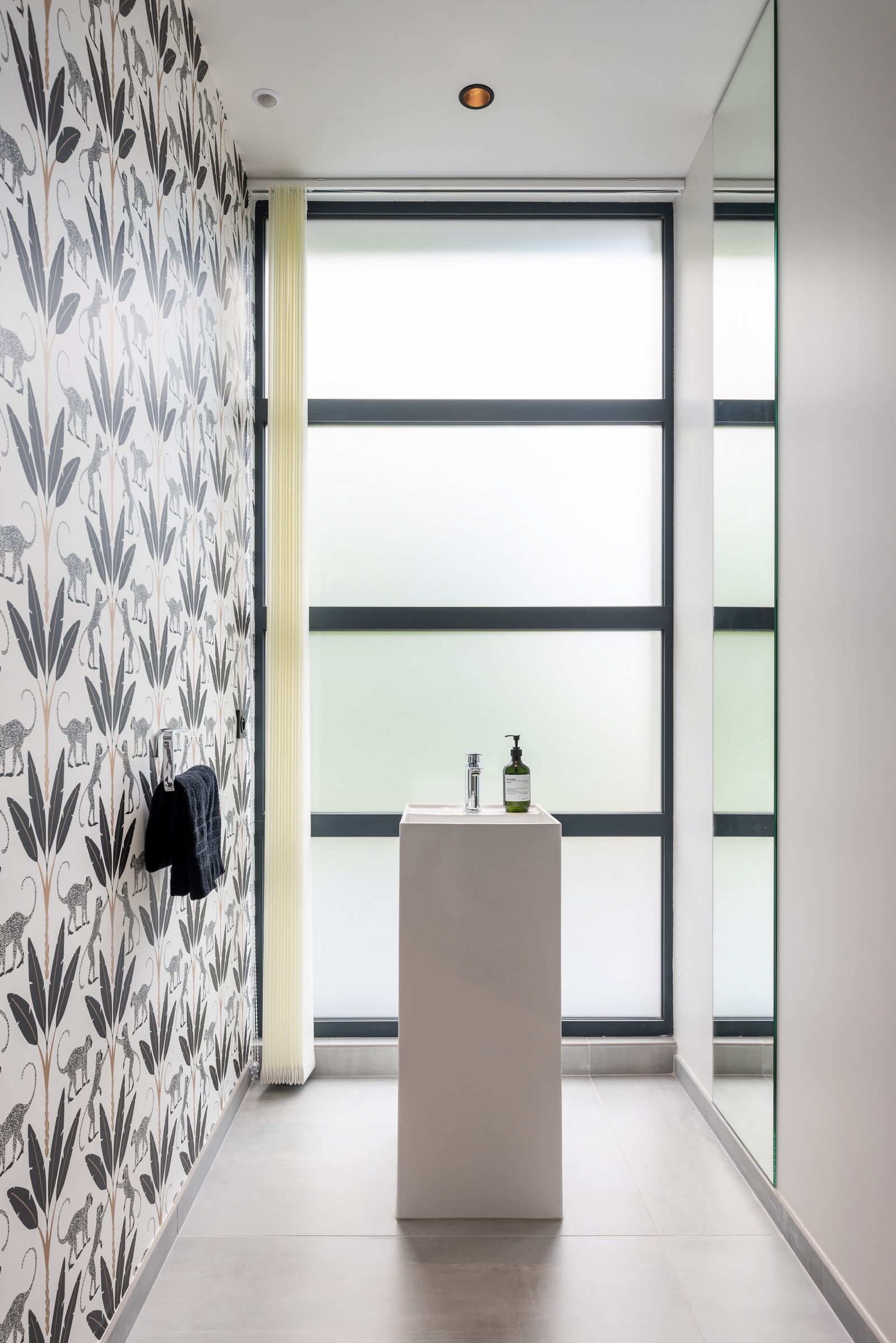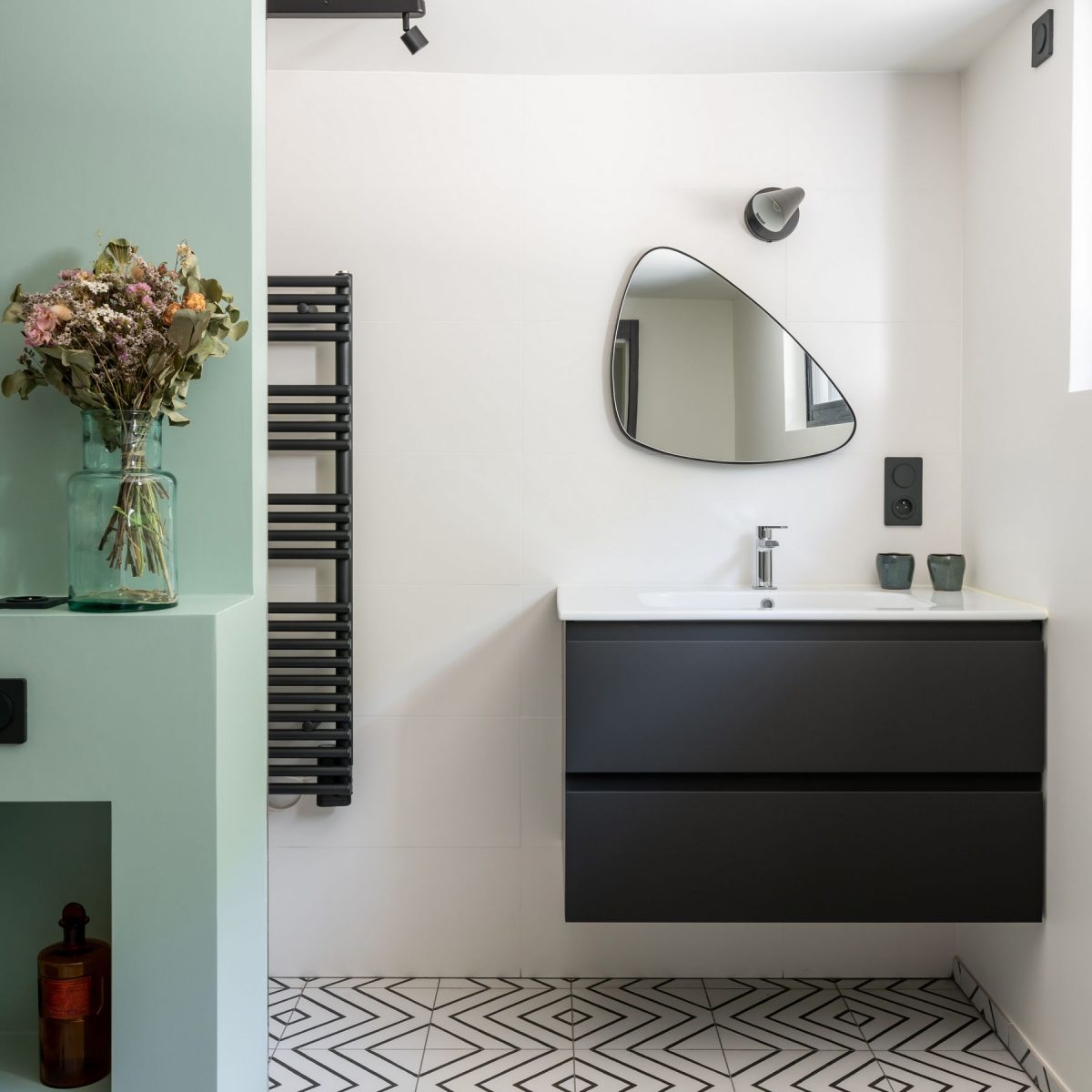 Agrandie par le large miroir, rythmée par deux vasques et raffinée par le carrelage sombre, cette pièce très lumineuse fait définitivement preuve de caractère.