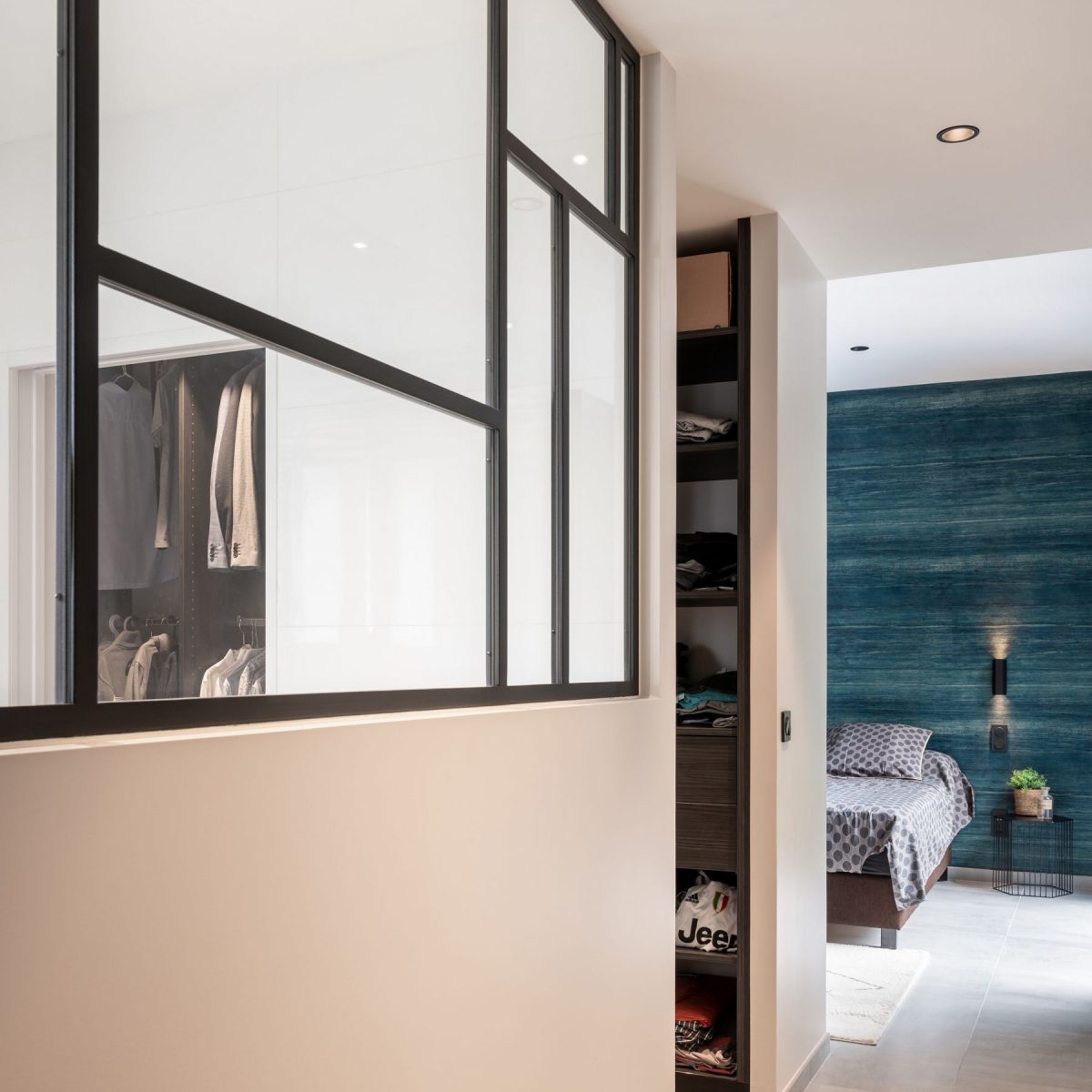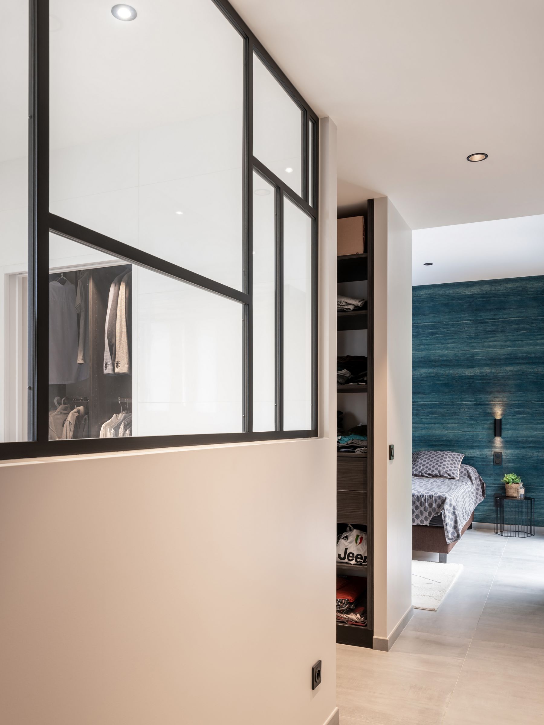 Classiquement déclinée en trois espaces : chambre, dressing et salle de bain, séparée des autres espaces par une verrière.