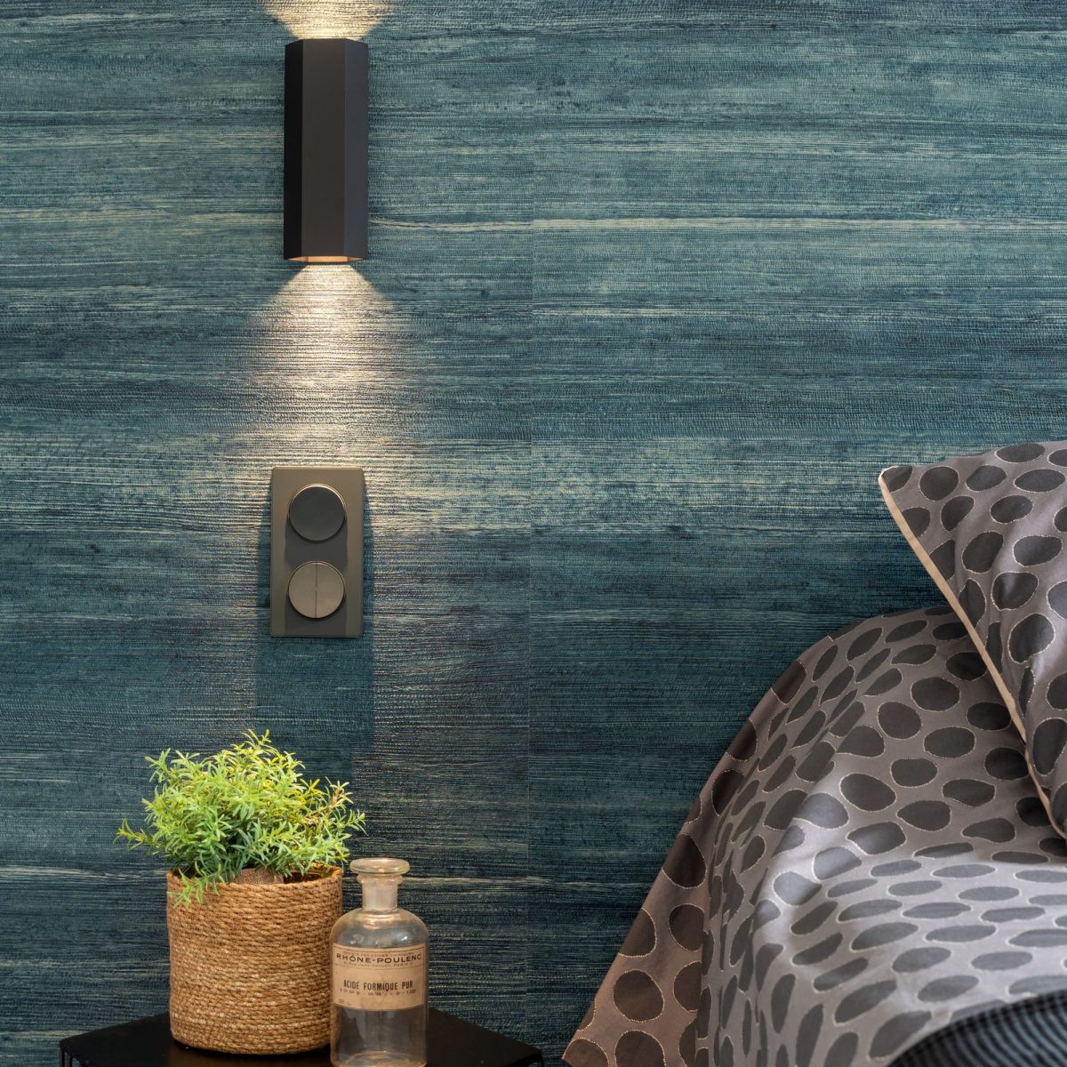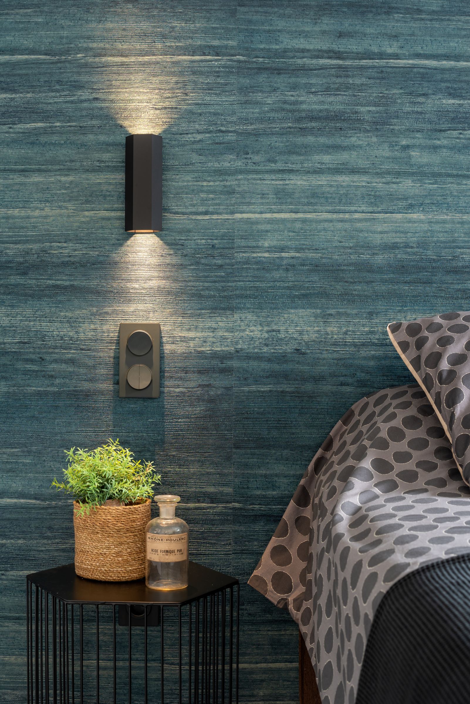 La tête de lit fait office de table de chevet grâce à ses prises et ses niches. Elle libère habilement l’espace de chaque côté du lit.