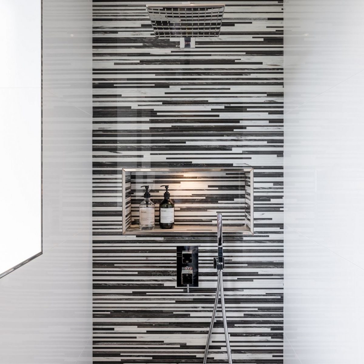 Par soucis d’homogénéité, un carrelage grand format a été intégré dans toutes les pièces de vie et de nuit.