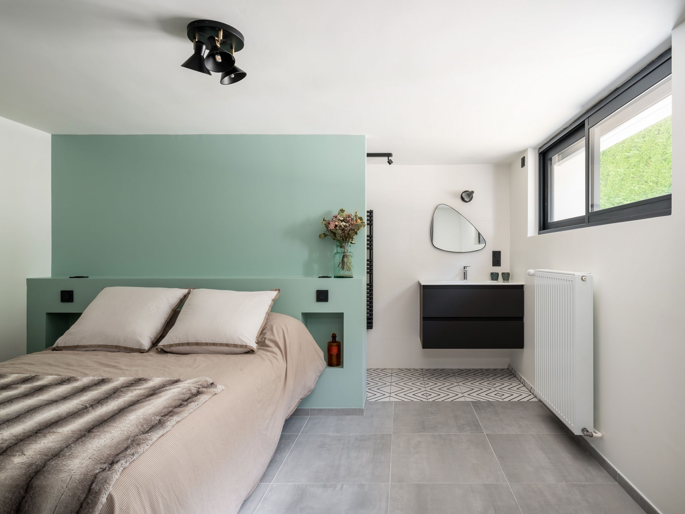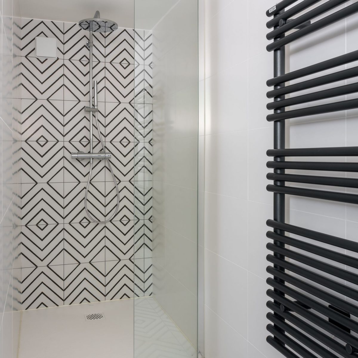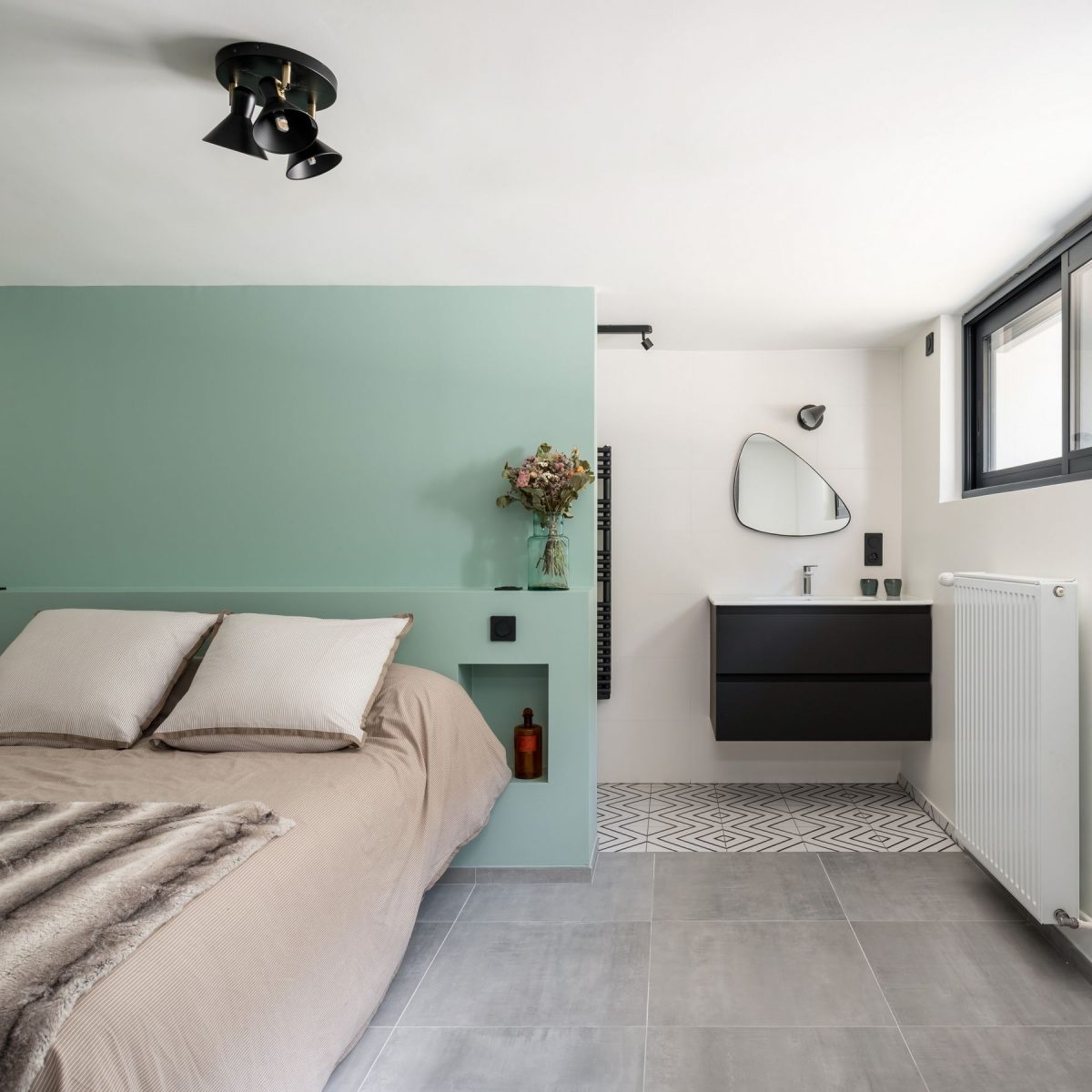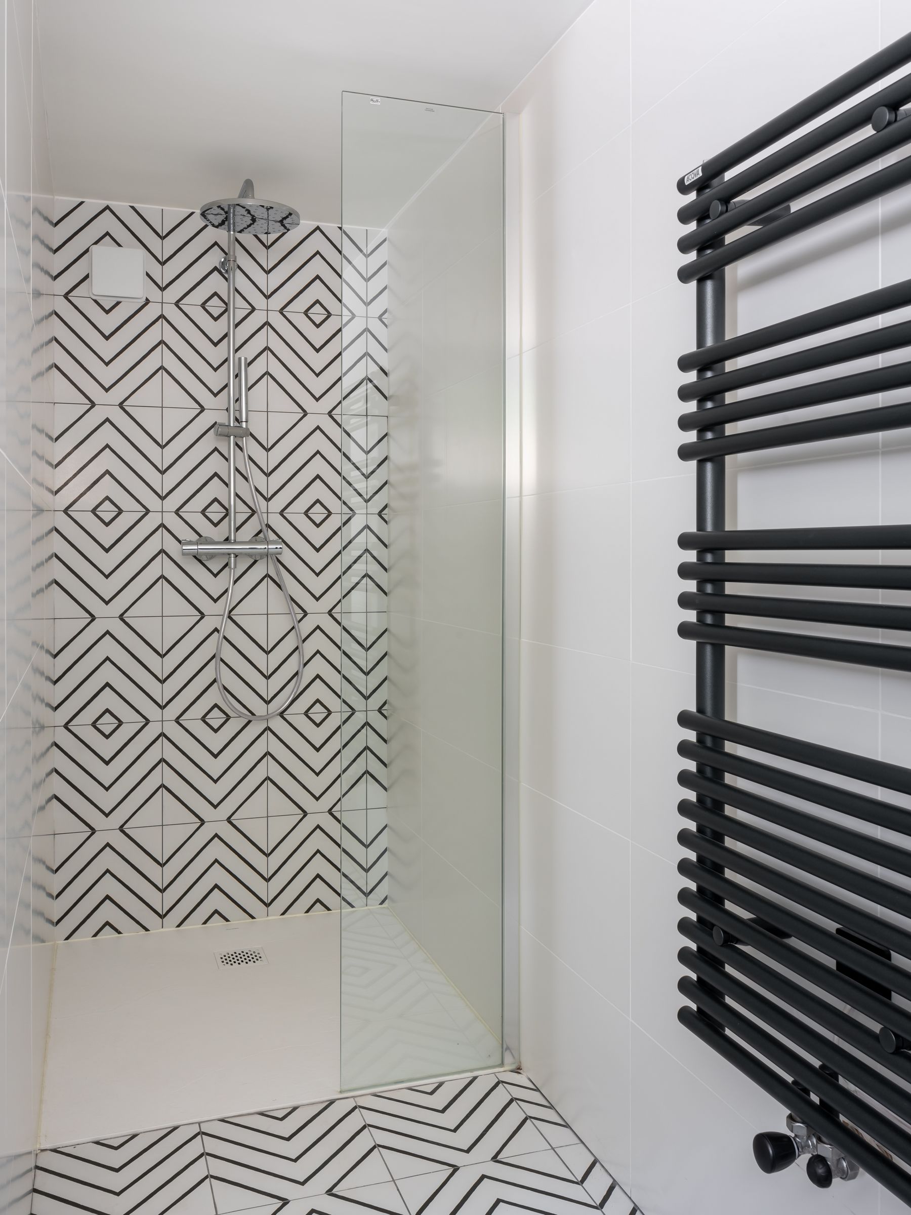 La salle d’eau, située en arrière-plan du lit, apporte un côté déco avec son carrelage à motifs graphiques.